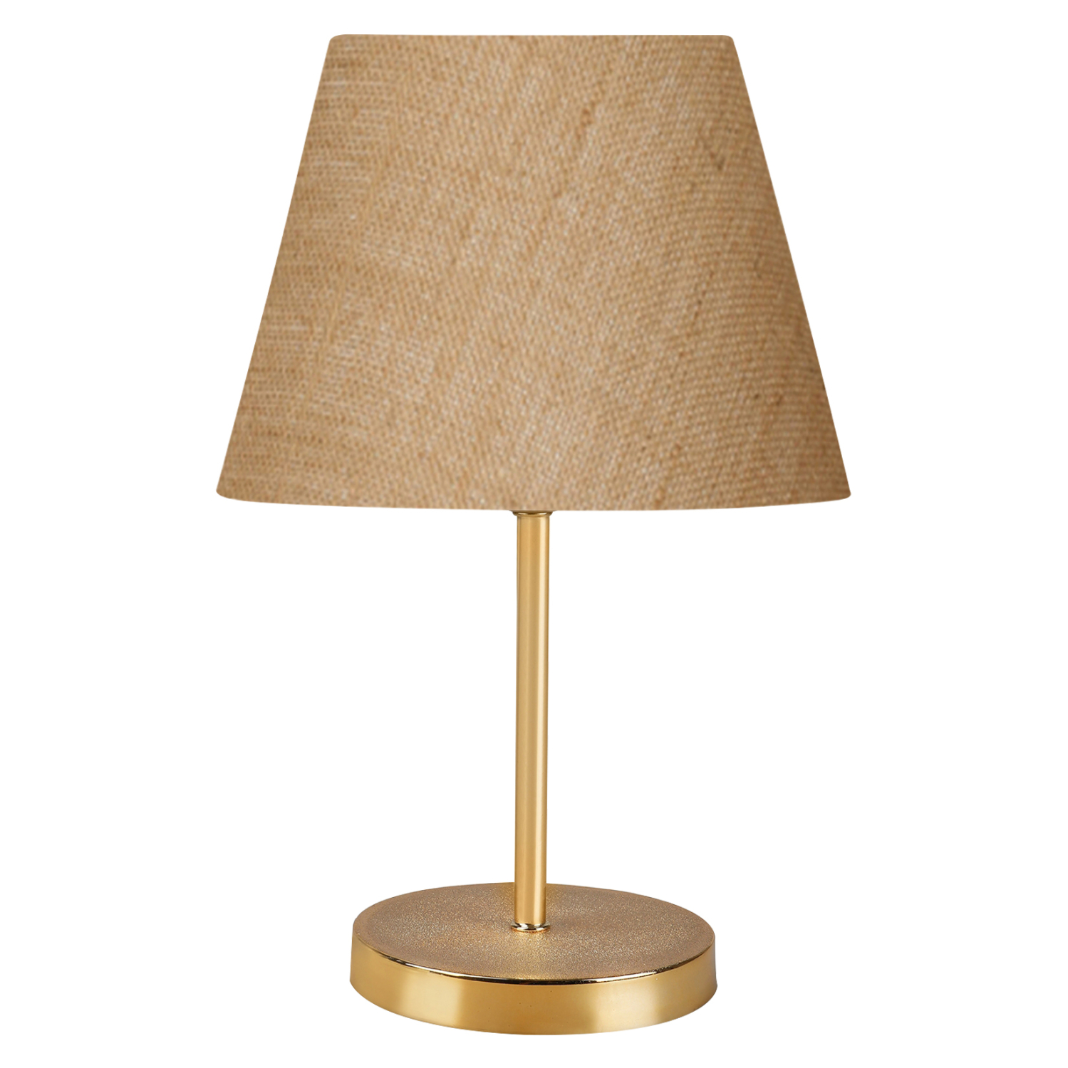 Μοντέρνο επιτραπέζιο φωτιστικό με κυκλική βάση και κολώνα σε χρυσό χρώμα, και μπεζ της άμμου υφασμάτινο τραπεζοειδές καπέλο. Πρόκειται για διακοσμητικό φωτιστικό, σε απλή και λιτή γραμμή. Το φως διαχέεται στον χώρο ευχάριστα και η αντανάκλασή του πάνω στην χρυσή κολωνίτσα του φωτιστικού αλλά και στην χρυσή επιφάνεια της βάσης, παιχνιδίζει ευχάριστα στο μάτι. Αυτού του είδους τα φωτιστικά δεν προορίζονται για φωτιστικά διαβάσματος και αυτό πρέπει πάντα να λαμβάνεται υπόψη κατά την επιλογή τους. Είναι καθαρά διακοσμητικά και το ταίριασμά τους με τον περιβάλλοντα χώρο θα πρέπει να είναι αρμονικό. Αυτό το φωτιστικό είναι κομψό και βολικό σε διαστάσεις παρέχοντας αμέτρητες δυνατότητες «δεσίματος» με την υπόλοιπη διακόσμησή σας. Είναι ένα μικρό έργο τέχνης.