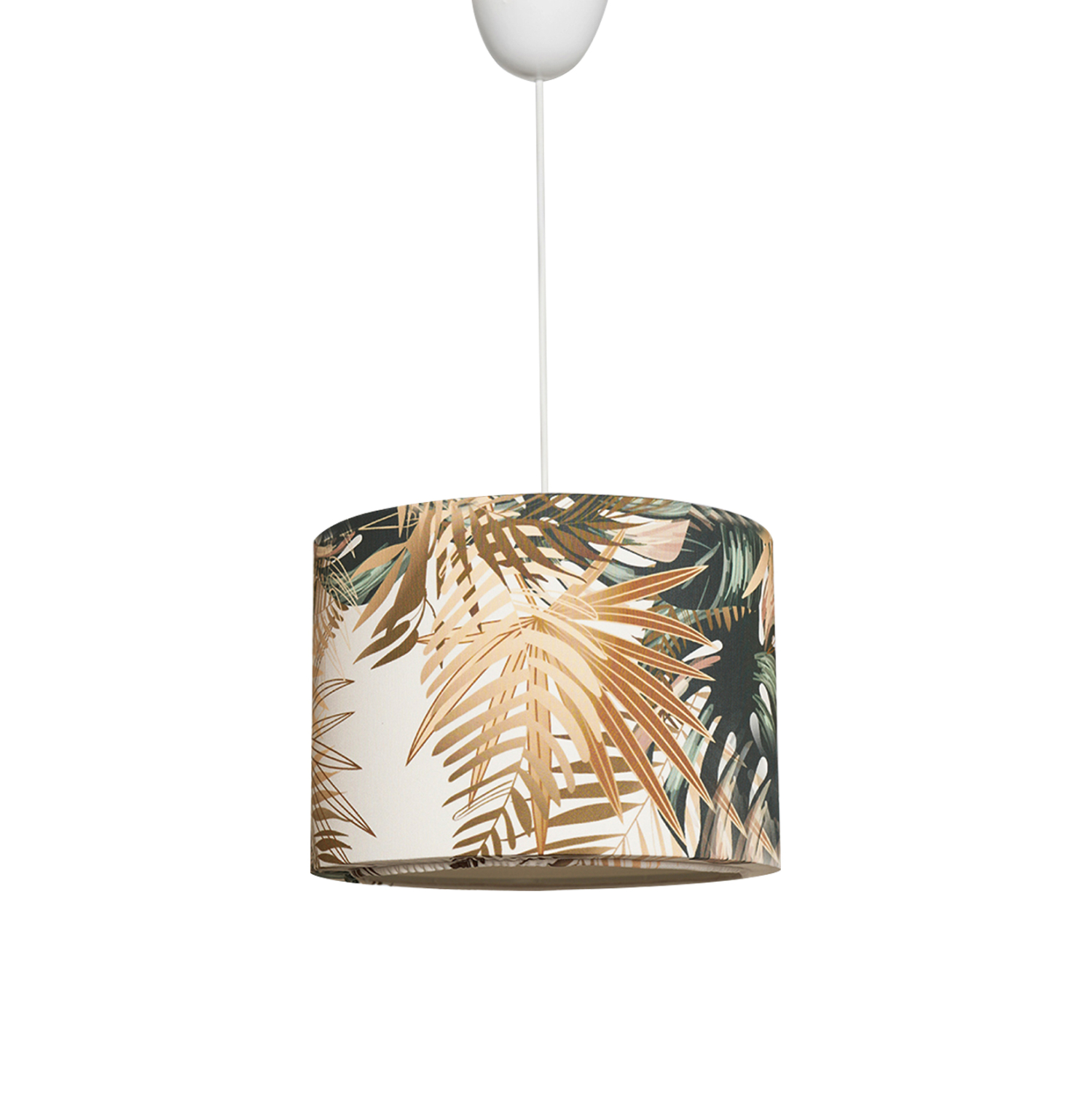 Μοντέρνο κρεμαστό φωτιστικό οροφής, κατασκευασμένο από μεταλλικό σκελετό και επενδυμένο από ύφασμα με tropical μοτίβο.