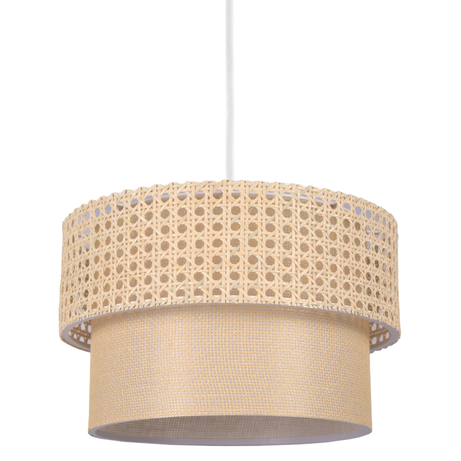 ΠΛΕΟΝΕΚΤΗΜΑΤΑ: Η αισθητική υπεροχή αυτού του φωτιστικού θα το κάνει να ξεχωρίζει στον χώρο σας γιατί έχει μια απλοϊκή αλλά καλλιτεχνική εμφάνιση. Ο μεταλλικός του σκελετός είναι άψογα κατασκευασμένος ενώ το τύμπανο έχει δύο δακτυλίους. Ο εξωτερικός δακτύλιος είναι κατασκευασμένος από μπεζ rattan πλέξη, ενώ το εσωτερικό από ύφασμα στο χρώμα της μπεζ άμμου. Το αποτέλεσμα είναι εξαιρετικά κομψό σε εμφάνιση. Καταφέρνει να συνδυάσει μια ελκυστική μοντέρνα γοητεία με το ιδανικό μέγεθος, προσθέτοντας έτσι μια όμορφη διακόσμηση στην οροφή σας. Το ρυθμιζόμενο ύψος του μπορεί να προσφέρει διαφορετικά επίπεδα φωτεινότητας και οπτικής απόλαυσης. Εκτός από διάφορα δωμάτια του σπιτιού σας, μπορεί, επίσης, να ταιριάξει και σε επαγγελματικούς χώρους όπως εστιατόρια, καφέ, ξενοδοχεία κτλ. Η εντύπωση της μονοχρωμίας του φωτιστικού και το design αιχμαλωτίζει τα βλέμματα, αλλά ταυτόχρονα απαιτεί και ιδιαίτερη διακοσμητική συνοχή για να αναδείξει πλήρως τις αισθητικές αρετές του.