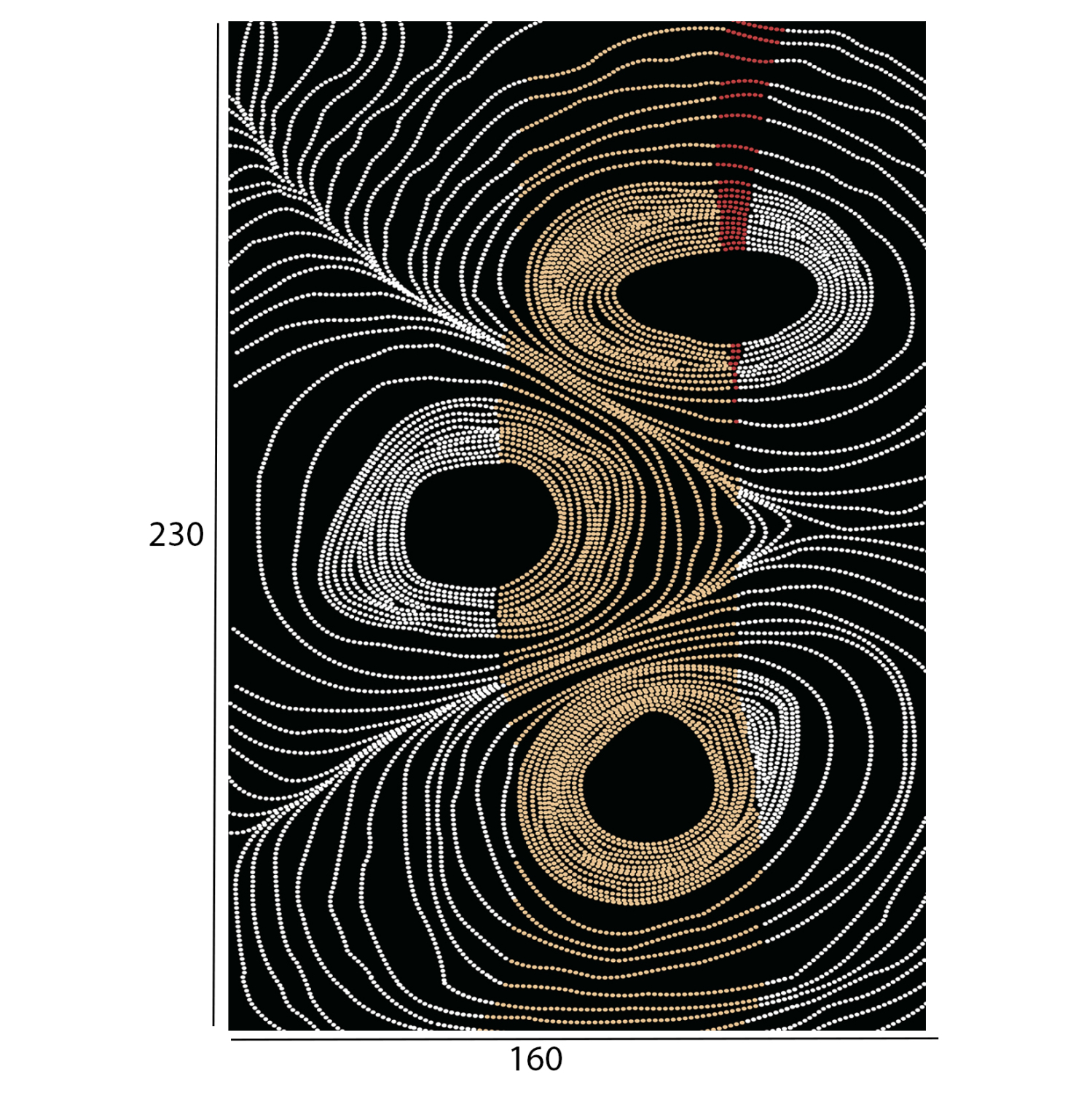 Το συγκεκριμένο χαλί είναι μοντέρνο από όποια οπτική κι αν το δεις. Έχει κυρίαρχα χρώματα το γκρι, και το χρυσό επάνω σε ολόμαυρο φόντο σε όλη την επιφάνεια του χαλιού. Το έντονο χαρακτηριστικό του είναι 3 ακανόνιστοι κύκλοι που μπορούν να ερμηνευθούν όπως το αντιλαμβάνεται ο καθένας. Γι’ αυτό και δίνει την αίσθηση της κίνησης στον χώρο και φυσικά θα προκαλέσει το ενδιαφέρον με την ιδιαίτερη λεπτομέρεια και την περίεργη ασυμμετρία των γραμμών του. Σίγουρα θα αναβαθμίσει αισθητικά το σαλόνι σας.